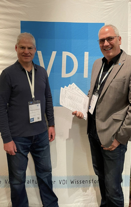 Das Bild zeigt mich beim konstruktiven Austausch mit Dipl.Ing. Frank Kasperkowiak (Vorsitzender des VDI Bezirksverein Siegen e.V.) beim VDI Wissensforum Trinkwasserhygiene 2022 in Köln.