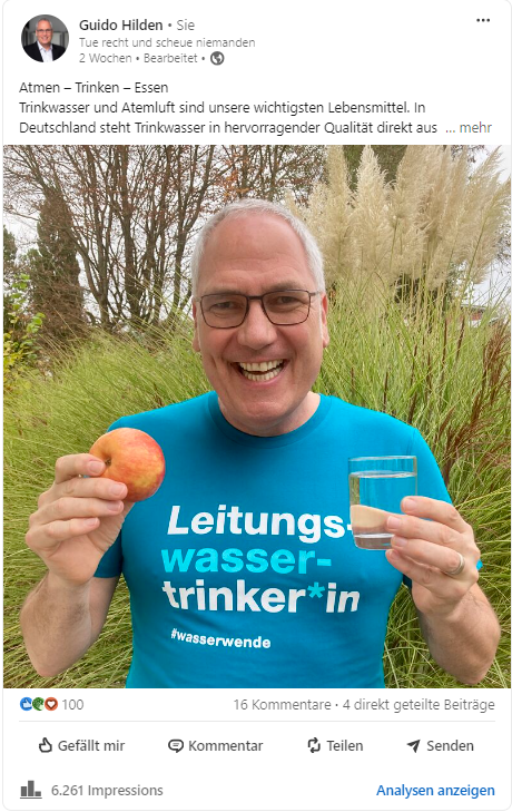 Dieser Verein bringt die #Wasserwende voran! Trinke Leitungswasser statt Mineralwasser aus Flaschen. Das hat erhebliche Vorteile, es spart Geld, Plastik und Kohlendioxid ein, es ist bequem (kein Schleppen, kein Pfandaufwand), rund um die Uhr verfügbar und Rohrquell (Trinkwasser aus der Leitung) hat eine sehr gute Qualität. Zur Absicherung der Qualität muss die Trinkwasserinstallation jedoch bestimmungsgemäß betrieben werden. – Das ist eine sehr umfangreiche Aufgabe und wird in der VDI 6023 sehr gut beschrieben, hier schließt sich der Kreis Trinkwasserhygiene und Leitungswassertrinker.
