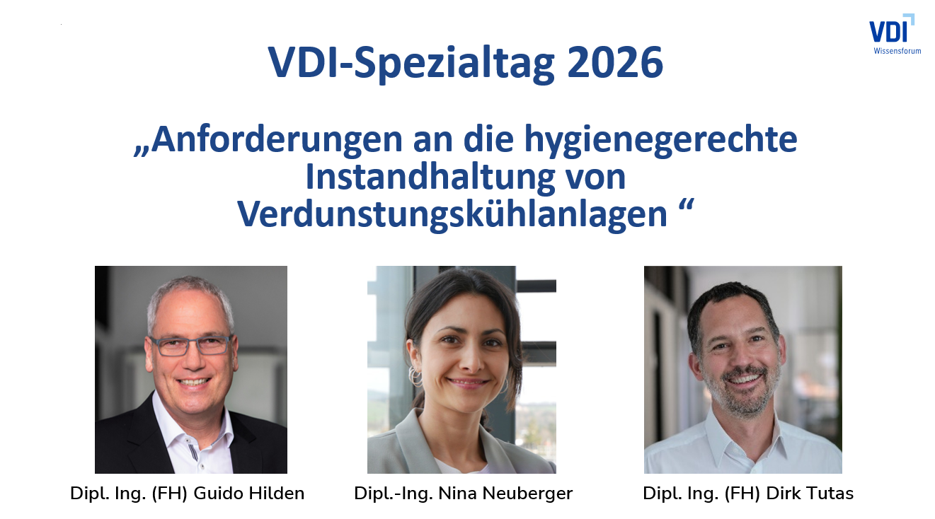 Sowohl das Programm, als auch die Inhalte vom Spezialtag (Anforderungen an die hygienegerechte Instandhaltung von Verdunstungskühlanlagen) sind bereits online, noch bis zum 31.12.2025 wird ein Frühbucherpreis gewährt.