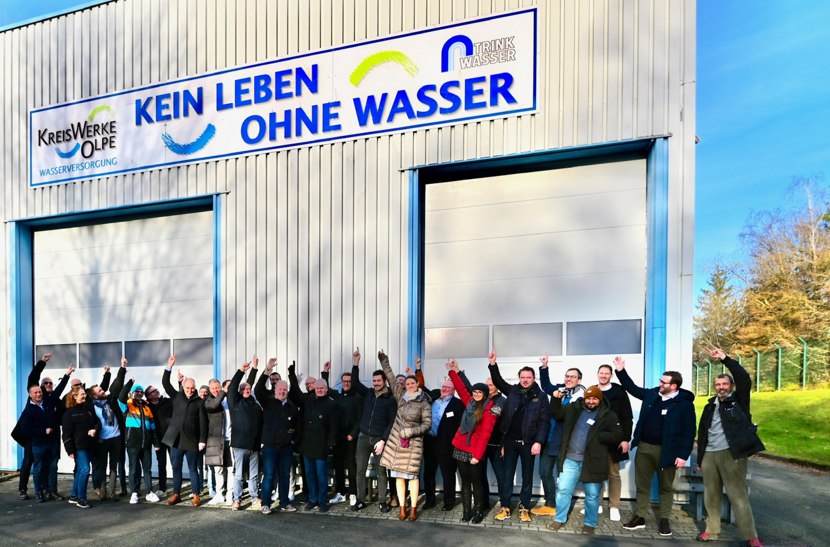 Dieses kleine Gruppenfoto der Geburtshelfer des Tages der Trinkwasserhygiene entstand am Tag der Trinkwasserhygiene 2024 nach der Besichtigung der Kreiswerke Olpe, wo alle Teilnehmende auf die wichtige Erkenntnis zeigen: